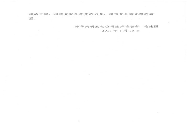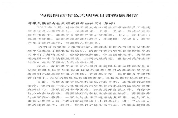 信中指出,神華天明發電公司員工毛建國家人長期患病,妻子又突發嚴重的心臟病,讓原本不富裕的家庭更是雪上加霜。在了解到相關情況后,神華天明項目部負責人高度重視,積極開展愛心捐款活動,為毛建國一家伸出了援助之手,幫助其度過難關。