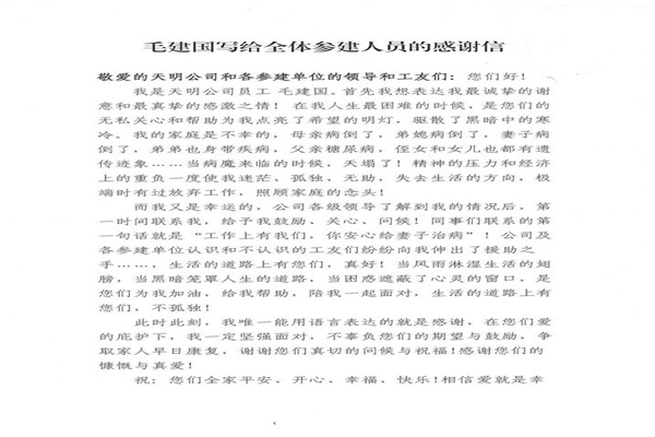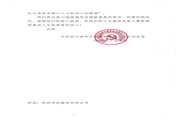 近日,公司神華天明項目部承建的神華四川江油煤炭儲備發電一體化新建工程收到了甲方神華天明發電公司及其員工毛建國寄來的感謝信,對項目部積極組織愛心捐款活動,幫助毛建國家人一事表示衷心的感謝。